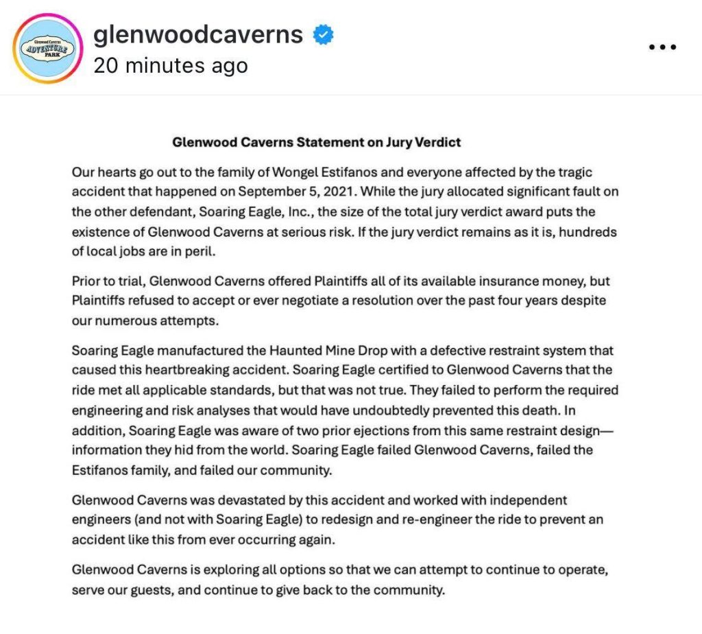 The park posted (and then apparently removed) this statement, indicating that they’d offered policy limits and blaming the ride maker.